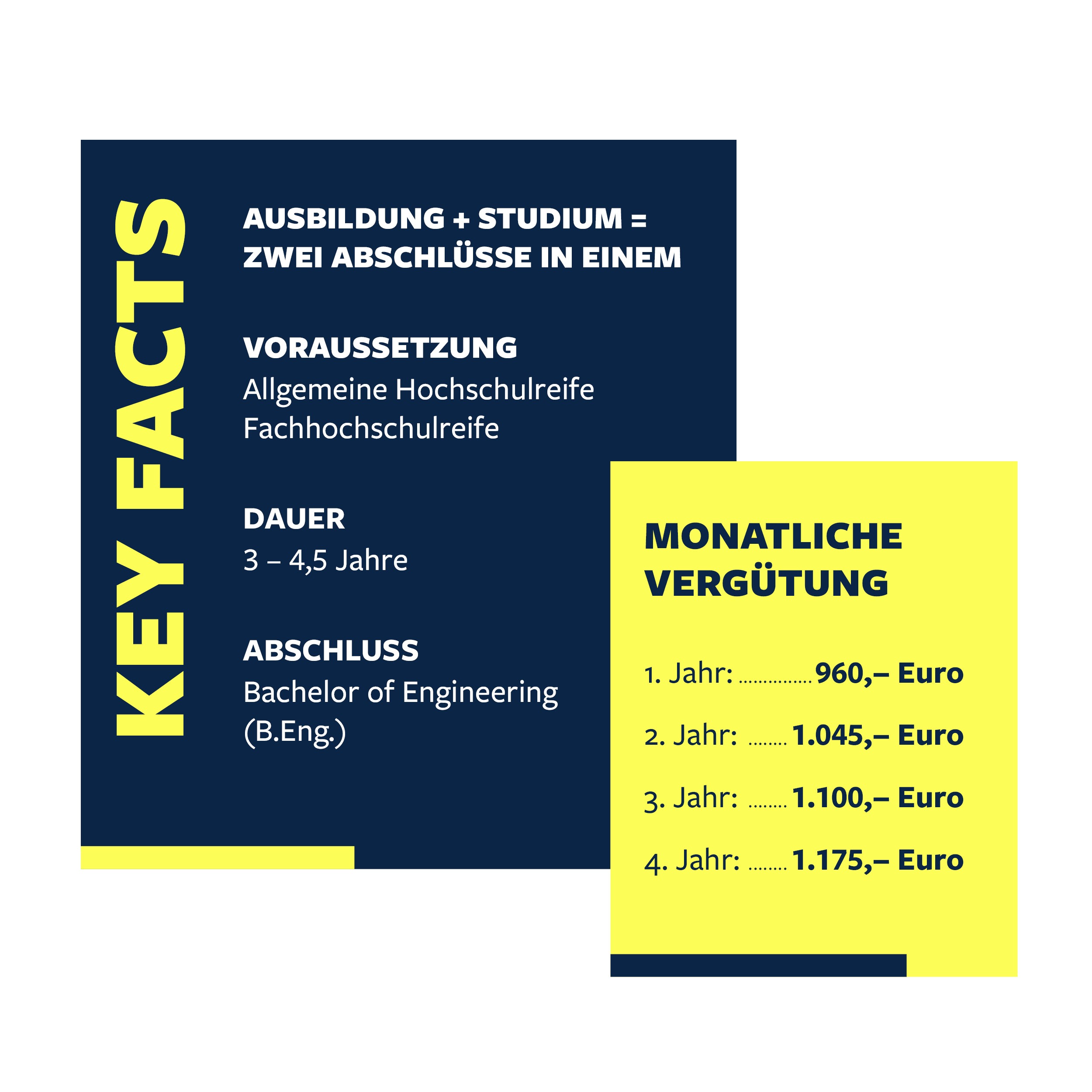 In den ersten zwei Jahren deines dualen Studiums machst du eine Ausbildung in einem der oben genannten Ausbildungsberufe. Da es sich um eine verkürzte Ausbildung handelt, beginnst du deine Lehre direkt im zweiten Lehrjahr. Mit dem zweiten Ausbildungsjahr beginnt auch dein Studium, bevor du dich ab dem 5. Semester voll und ganz auf das Studium konzentrieren kannst.